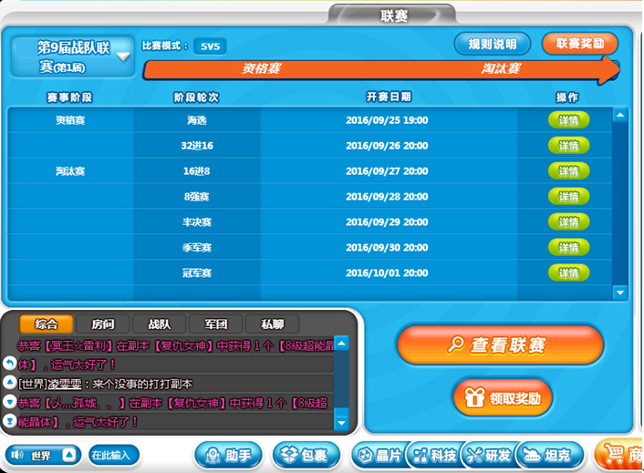 聯賽:戰隊間的淘汰排位賽,不定期舉行一屆。以戰隊為單位進行報名,先進行資格賽,根據戰鬥積分決出前32名。前32名的戰隊,再進行逐一的淘汰賽,最終決出排名。根據排名發放獎勵。