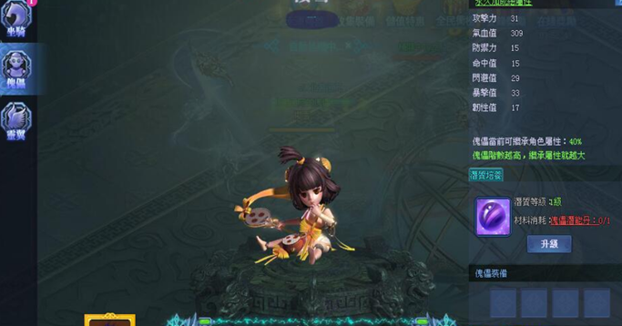 傀儡除了進階之外,潛能的提升也會增加其戰鬥力,潛能的提升需要用到潛能丹,潛能丹可以用進階材料合成獲得,也可以通過遺跡尋寶、神秘商店以及多人副本的通關禮包獲得。傀儡潛能的上限取決於階數,所以進階永遠是第壹位的。