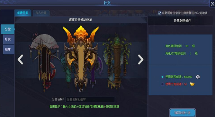 2.1創建分堂 點擊主介面【社交】按鈕或快捷鍵“F”可打開社交面板,默認會選中分堂面板;分堂創建條件設定為角色等級+VIP等級,可選取消耗銀兩或者消耗元寶來創建;達到創建條件後可輸入霸氣的分堂名稱並選擇一種分堂專屬的標示後進行預覽,當預覽效果符合您的需求即可點擊右側的【確認創建分堂】按鈕進行創建分堂