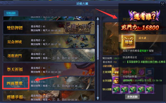 在四面楚歌活動中,妳將孤身壹人面對其他玩家,他們都將成為妳的對手,而妳唯壹能做的僅僅只是活下去。壹旦三次重生機會都用完了,就會被傳送出活動外,也就與大獎無緣。