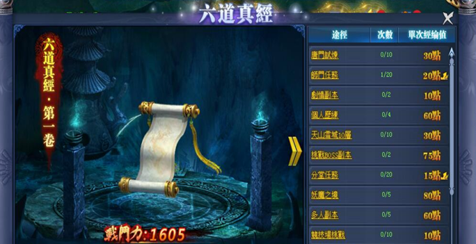 玩家可通過完成每日必做的事項來獲得經綸值,達到壹定的經綸值時可以在面板左側點擊【煉體】按鈕進行煉體,每次煉體都將點亮壹顆球體,10顆球體都點亮則進階,獲得屬性提升,每次進階都能強化場景中帶來的視覺特效,接下來看看每卷六道真經的場景效果吧!
