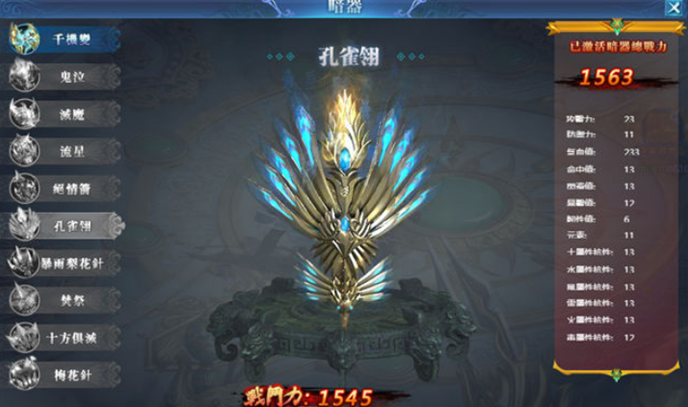 孔雀翎:因暗器釋放效果如孔雀開屏般而馳名,更是七種武器之一,屬於遠程攻擊類暗器,絢麗過後,敵人將短時間內失去還手能力。它由純金鑄成,未使用時呈圓筒狀,外形十分普通。圓筒上面有兩個機關,只要按動機關,筒裏暗藏的鐵器便飛射而出。當敵人看得目瞪口呆時,便要了無數人的性命。玩家戰鬥時,遠距離攻擊造成遠方的單體敵人大量傷害,還能讓其「沉默」,數秒之內若無法使用技能,就如同廢人一般。
