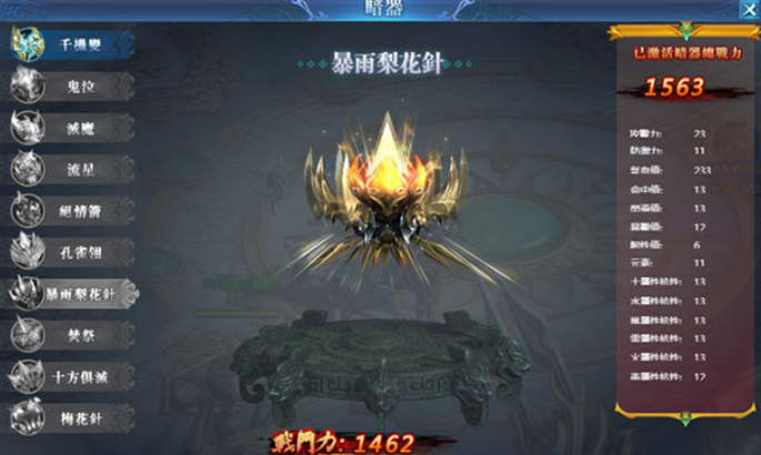 暴雨梨花針:原創出自知名所著武俠小說,長七寸,厚三寸,發射之時,共二十七枚銀針激射而出,「出必見血,空回不詳,急中之急,暗器之王」。玩家裝備「暴雨梨花針」後,即使面對再多的敵人,銀針一出,便可解決一大波敵人,號稱暗器之王令敵人聞風喪膽。
