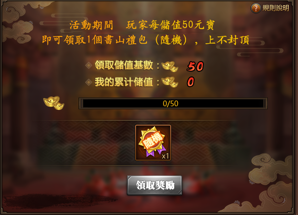 活動期間,玩家每儲值50元寶,即可領取一個徽章禮包(隨機),上不封頂。
