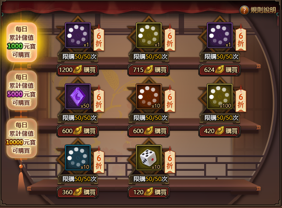累計儲值到達指定元寶即可開啟對應商店,儲值金額越高,商品價格越低。