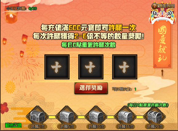 每儲值500元寶即可許願一次,每次許願獲得2-6倍不等的數量獎勵。每日0點重置許願次數。