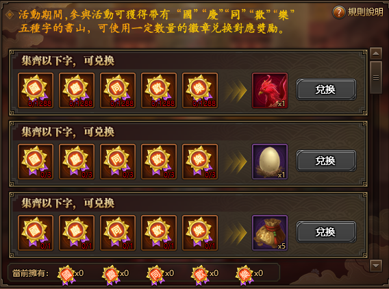 活動期間,參與活動可獲得帶有“國”、“慶”、“同”、“歡”、“樂”五種字樣的徽章,可使用一定數量的徽章兌換獎勵。