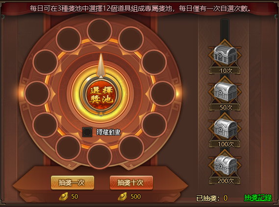 每日可在三種獎池中選擇12個道具組成專屬獎池,花費50元寶可抽獎一次。