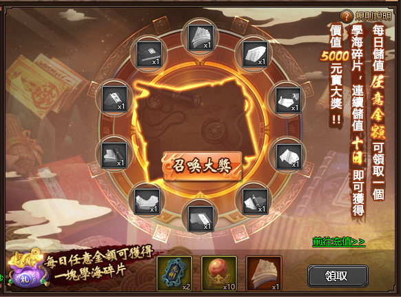 每日儲值任意金額可獲得一個學海碎片,連續儲值10日即可獲得價值5000元寶的寶箱。