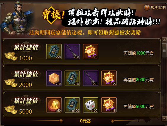 活動期間玩家累計儲值達標,即可領取對應檔次獎勵,更有神將曹操相送哦~
