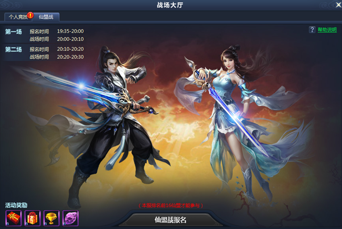 每週一、三、五8:00-8:30會開啟仙盟戰,仙盟戰一共分兩場,每一場開始之前需要先報名,報名後等待戰場開啟即可進入爭奪。