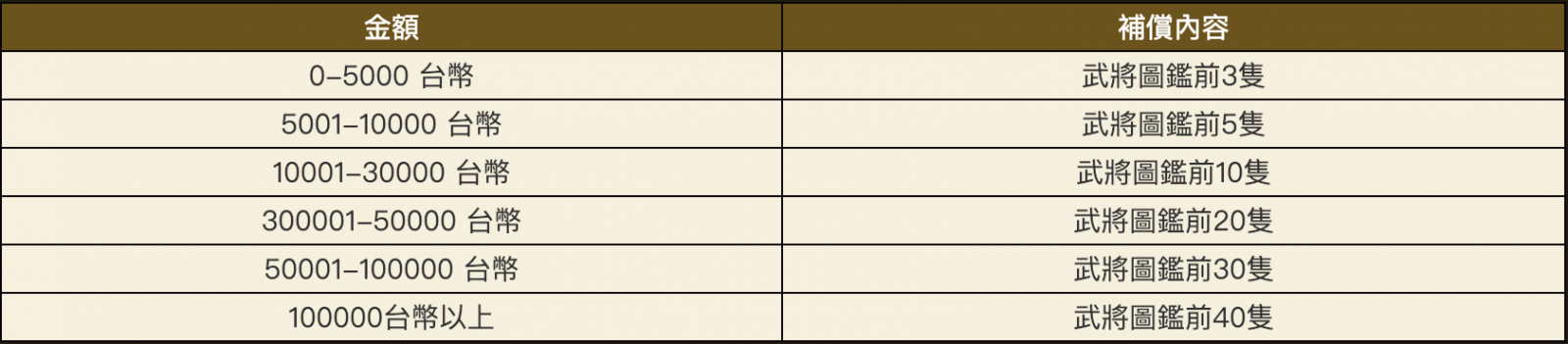 120區-131區 玩家若於2018-02-08 00:00至2019-01-23 00:00成功儲值任意金額的帳號皆可申請,玩家在申請時間內至客服中心回報,會依照2018-02-08 00:00至2019-01-23 00:00期間內的儲值紀錄補償玩家2倍的元寶並依照玩家儲值的金額額度,派發補償道具,補償內容為下