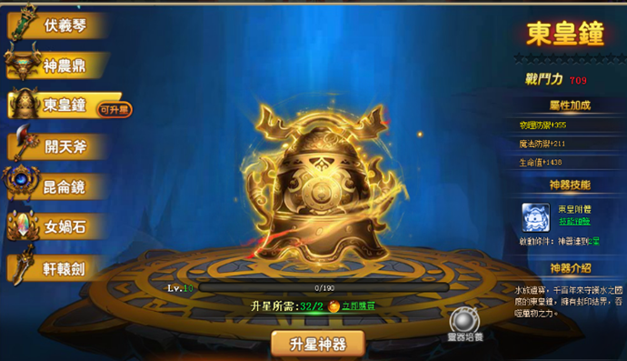 消耗神器啟動卡可以啟動上古神器,啟動後可提升角色的基礎屬性,消耗神器碎片可以升級上古神器,升級後可提升神器的基礎屬性,消耗神器之魂可以升星上古神器。