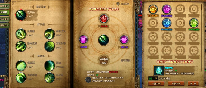 職業技能,分群攻和PK兩系,群攻系技能適合挂機升級,群體PK,PK系技能適合打BOSS,單體PK;每一系固定綁定4個技能(不能更換)消耗金幣可升級技能等級並增加技能傷害,技能等級和人物等級掛鉤,爵位達到準勳爵後,玩家可通過使用【Tab】切換群攻和PK系技能。
