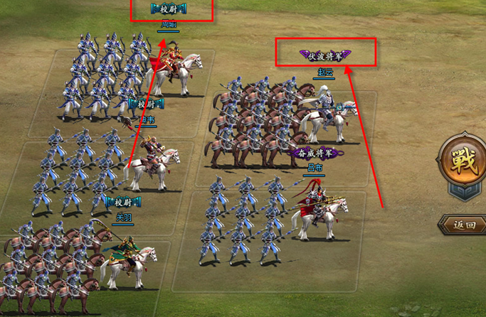 遊戲中每個武將所率領的部隊主要分為四大兵種,分別是槍兵、騎兵、盾兵、和弓兵,而兵種之間會有互相克制作用,在戰場上根據敵軍的兵種選擇派遣相對克制的部隊,才是制勝王道。