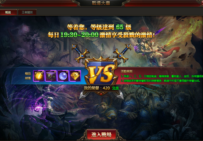 【參與方式】:玩家等級達到65級時,可以參與冰火戰場;活動開啟時,通過遊戲右上角圖示“戰場”可參與該活動。