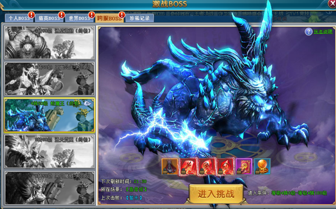 跨服 BOSS 每隔一個等級段都會有新的 BOSS,每個等級 BOSS1 個 BOSS。需要達到相應的等級才能前往爭奪挑戰。
