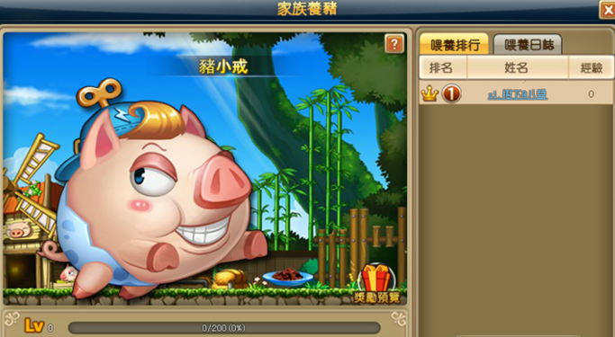 玩家可金幣餵養或者食物餵養豬小戒,可升級小戒並且獲得個人貢獻和家族貢獻,每週可開啟2次小豬別跑玩法,合理利用彩禮道具阻止小戒逃跑可獲得個人貢獻和家族貢獻,每天可開啟一次浴場,成員之間搓背、扔肥皂可提神醒腦,降低玩家的疲勞度。