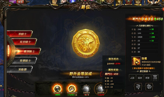 野外金幣加成等特殊效果,達到見習男爵爵位後開啟爵位聖器,穿戴不同的爵位聖器可以獲得不同的屬性加成。