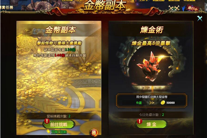 金幣副本是遊戲內獲得金幣的主要途徑之一,金幣副本下分金幣副本、煉金術、金幣BOSS三個不同的玩法(煉金術和金幣BOSS暫未開放)