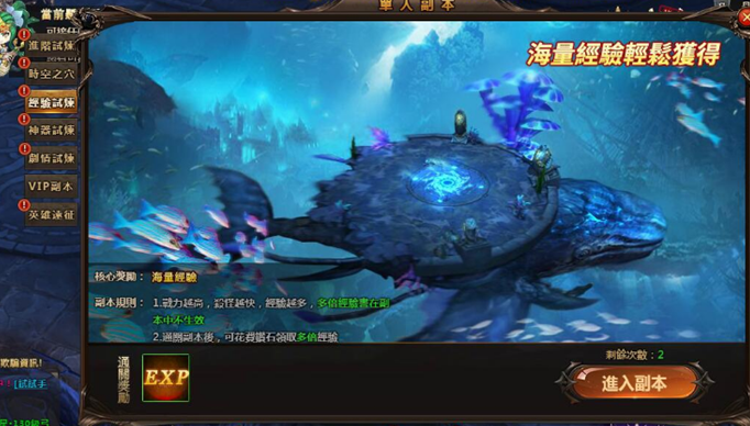 經驗副本:根據角色等級,劃分為多個等級的副本,每個副本的怪物、通關經驗基數不同,副本內怪物刷新按照波數進行刷新;副本有限定的時間,玩家需要在限定時間內完成副本內容,玩家在副本內被怪物擊殺時,副本結束,獲得當前波數經驗。